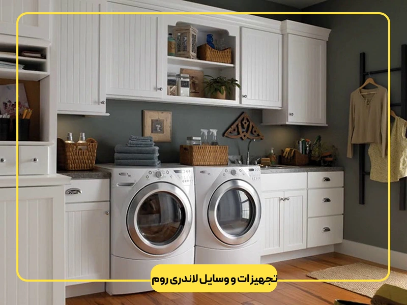 لاندری روم برای عملکرد مؤثر، نیازمند تجهیزاتی کاربردی و متناسب با نیازهای خانواده است. مهمترین وسایل شامل ماشین لباسشویی، خشککن، اتو، میز اتو، سبد لباس چرک، قفسه یا کابینت برای نگهداری شویندهها، و سینک شستوشوی دستی است. در طراحی حرفهای، حتی تجهیزاتی مانند سیستم تهویه، نورپردازی مناسب و قلابهایی برای آویزان کردن لباسها نیز در نظر گرفته میشود.
