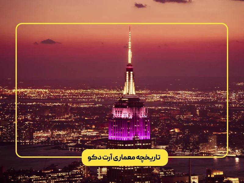 بنای تئاتر شامز- الیزه در پاریس سال 1913 ساخته شد و پیش زمینهای برای آرت دکو بود. اما در دهه 30 به آمریکا و اوج شکوفایی خود رسید. ساختمان کرایسلر در نیویورک با تزئینات مثلثی فلزی و ساختمان امپایر استیت با خطوط عمودی و فرمهای ساده، آرت دکو را نمایش میدهند. سپس این طراحی وارد هالیوود و طراحی داخلی خانه هنرمندان ثروتمند شد و تبدیل به نمادی از زرق و برق شد. اما با شروع جنگ جهانی دوم، جهان وارد بحران عملکردی شد و تجمل گرایی آرت دکو دیگر به درد نمیخورد. در این زمان بود که آرت دکو وارد افول شد و مدرنیسم میانه قرن جای آن را گرفت.