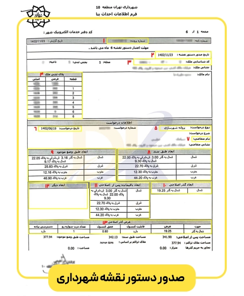 چه اطلاعاتی در دستور نقشه است؟ دستور نقشه شامل تعداد طبقات مجاز، سطح اشغال، کاربری ملک، تراکم ساختمانی، میزان اصلاحی (عقبنشینی)، ابعاد زمین و محل قرارگیری بنا است.